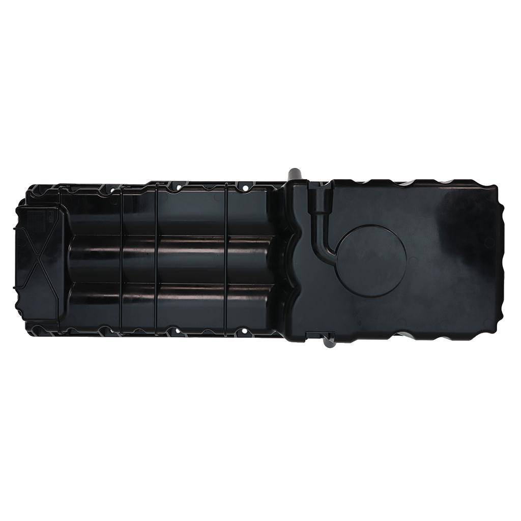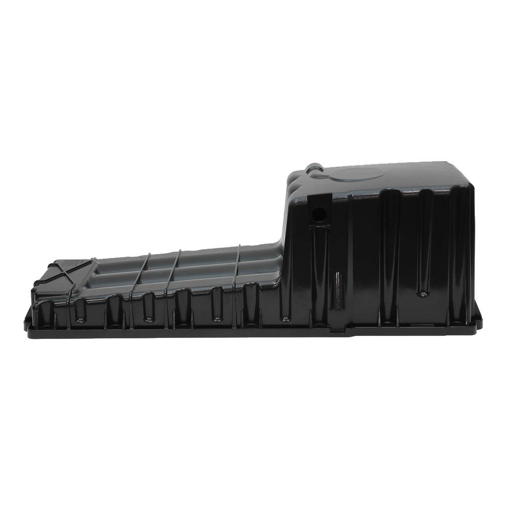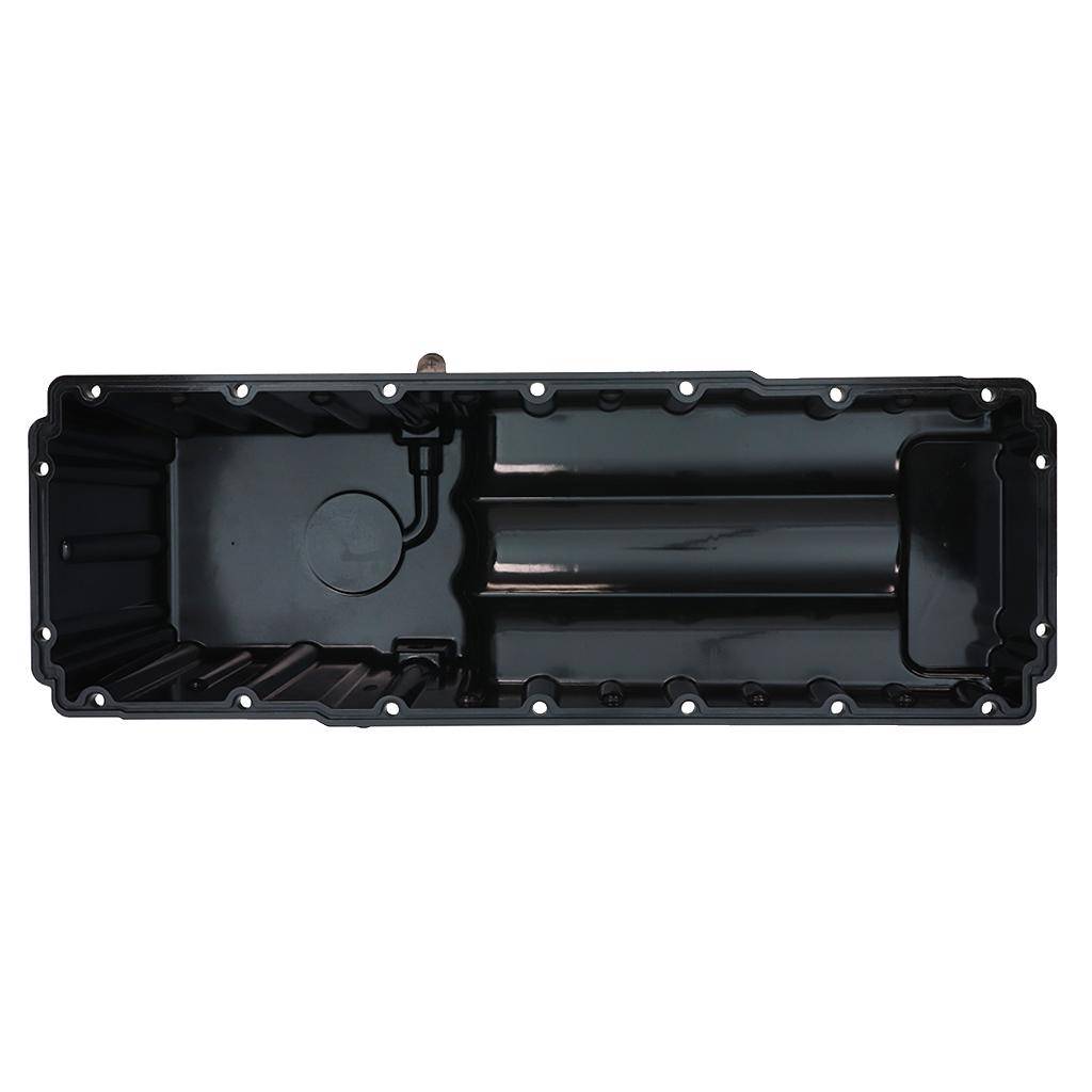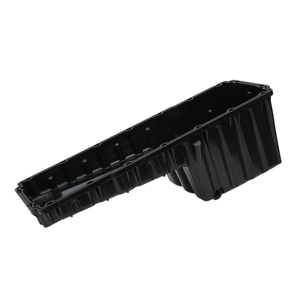 This front sump engine oil pan is made of plastic, finished in black and fits Detroit Diesel DD15 engines.